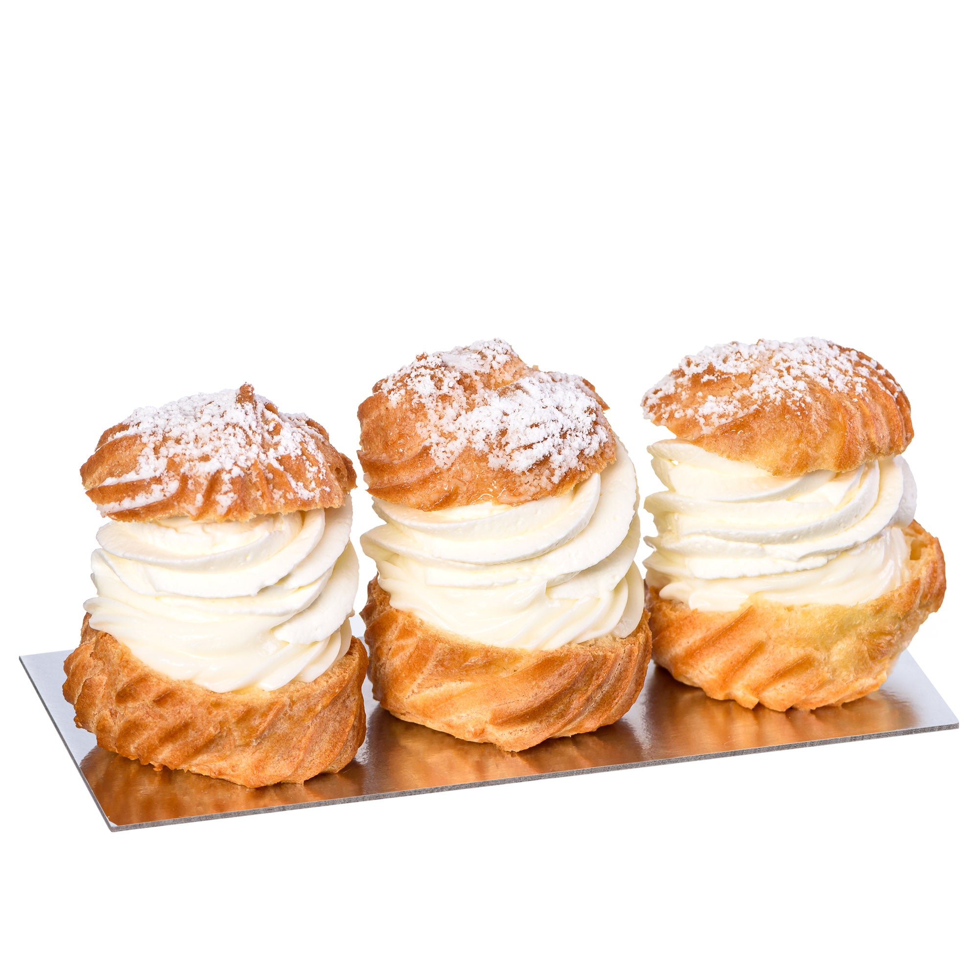 O prăjitură delicată cu aluat de choux, umplută cu o cremă fină de vanilie și decorată cu zahăr pudra.