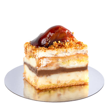 Prăjitura Lorena este un desert bogat și rafinat, care îmbină texturi și arome variate într-o experiență unică. Aluatul fin de choux, crema de vanilie și frișca delicată sunt completate de ganache-ul intens de ciocolată. Glazura de caramel și alunele caramelizate adaugă un plus de crocant și savoare. Este prăjitura perfectă pentru cei care apreciază deserturile elegante și sofisticate.