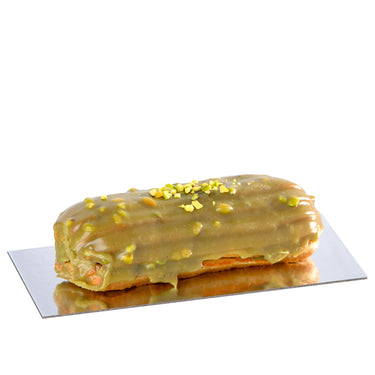 Un desert sofisticat, cu un aluat ușor de choux și o umplutură cremoasă de fistic. Glazura fină de ciocolată albă și fistic completează perfect gustul, transformându-l într-o experiență culinară deosebită.