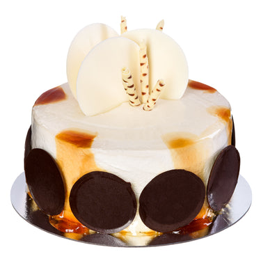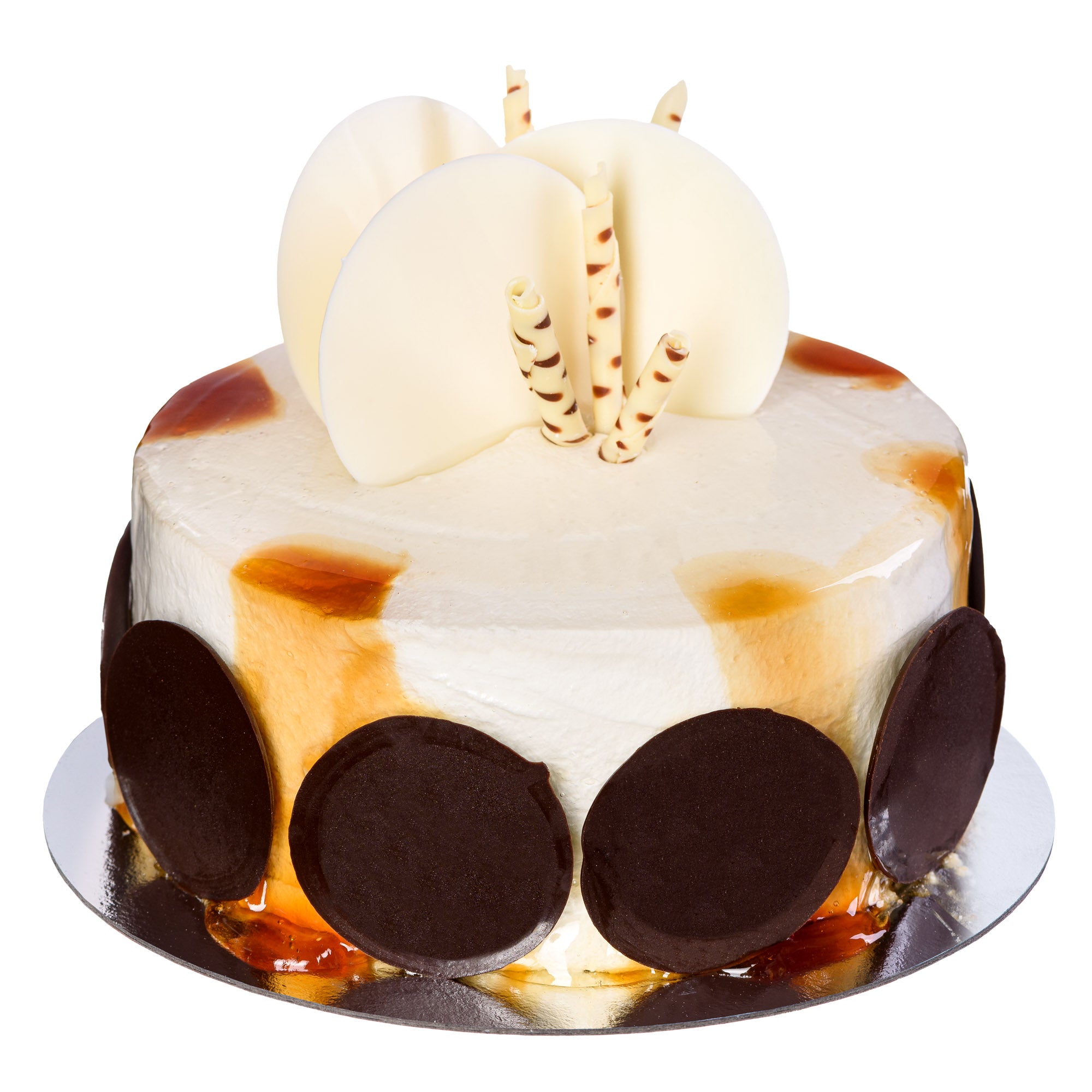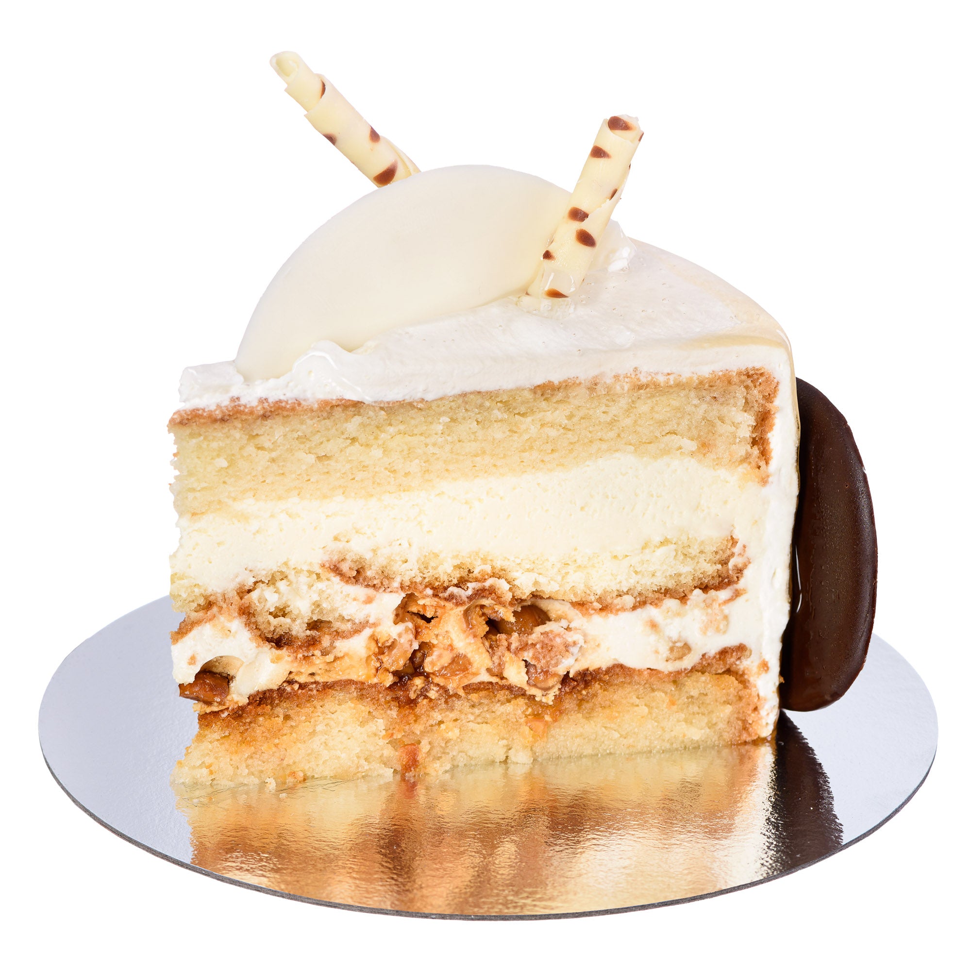 Un tort cu un blat însiropat și o cremă de mousse de ciocolată albă, combinată cu cremă de vanilie. Gustul dulce și textura catifelată sunt completate de un strat crocant de alune caramelizate.
