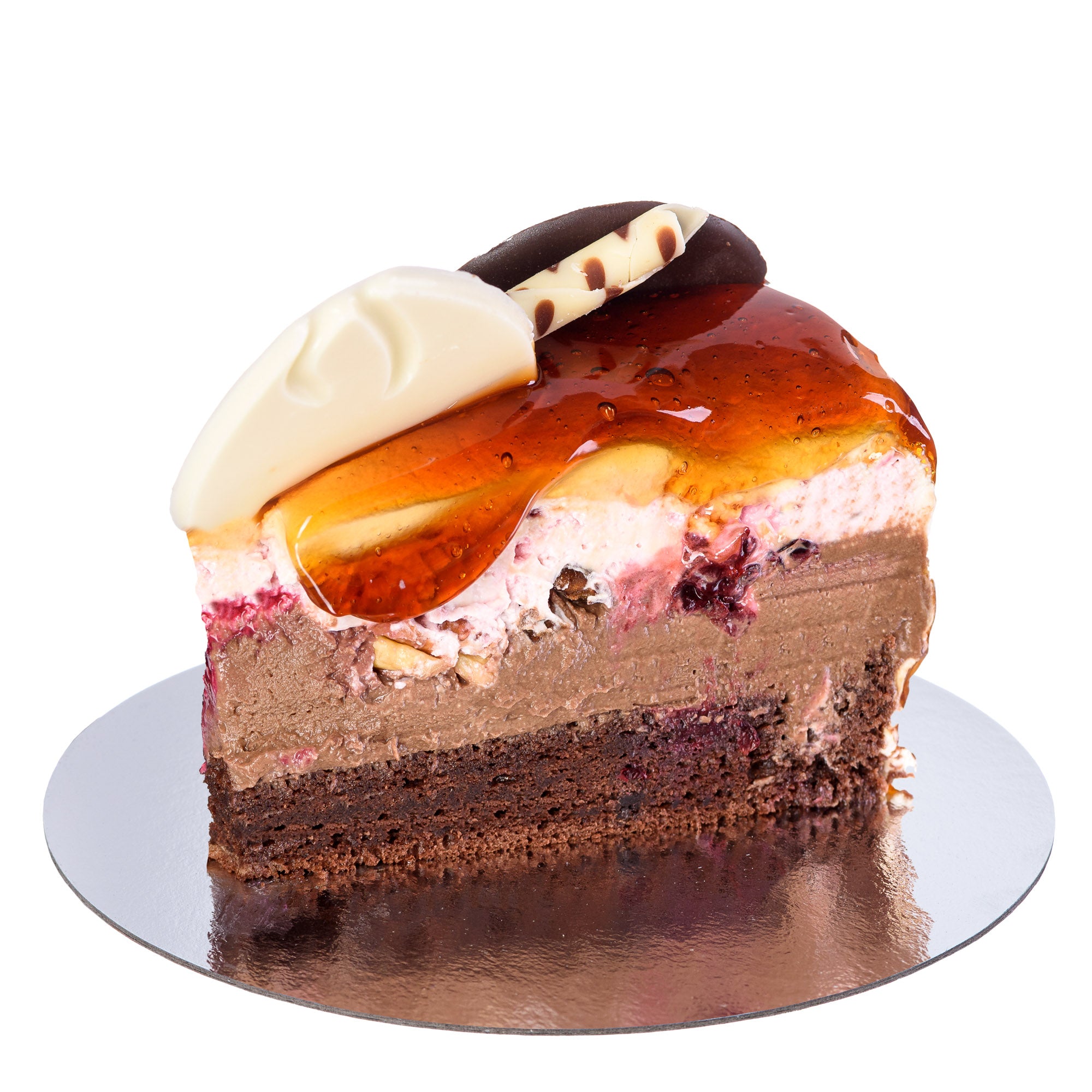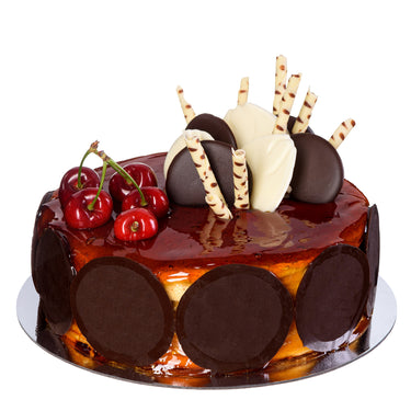 Un tort deosebit, cu un blat de cacao însiropat, completat de o cremă bogată de ganache de ciocolată, miez de nucă prăjită și vișine aromate. Un amestec de fructe de pădure și un gel de caramel adaugă un plus de rafinament, transformând fiecare felie într-o experiență complexă și savuroasă.