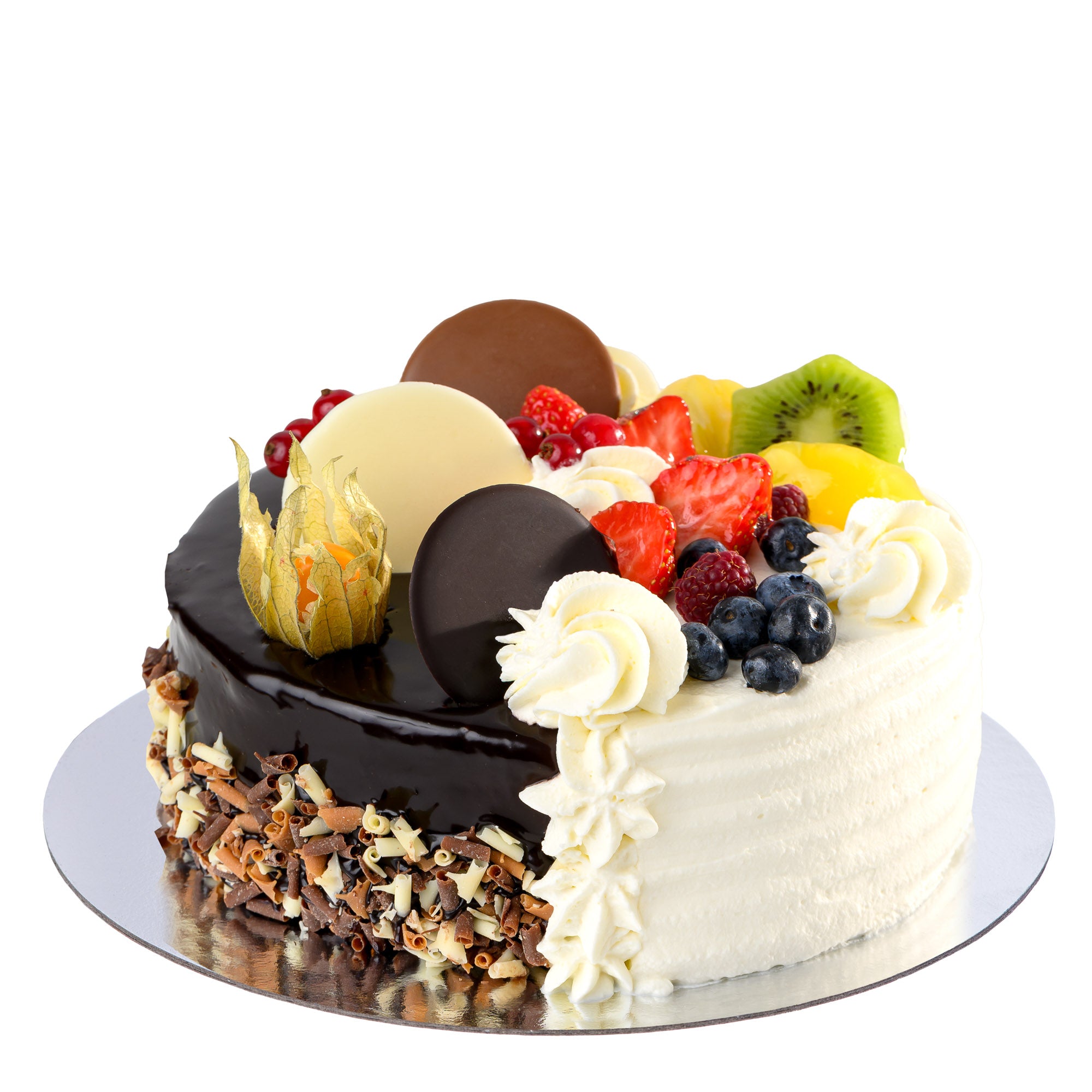 O combinație delicioasă între gustul clasic de diplomat și cel intens de ciocolată. Cu un blat alb însiropat, cremă de diplomat, ananas și piersici, pe o parte, și un blat de cacao cu ganache de ciocolată și glazură de cacao, pe cealaltă, acest tort îți oferă un amestec perfect de arome.